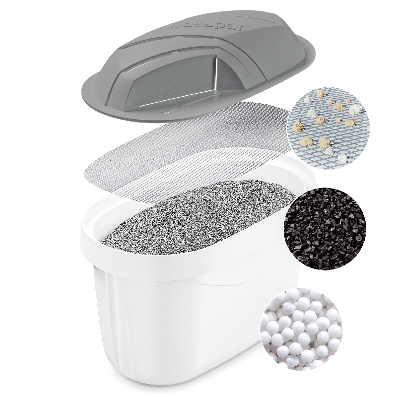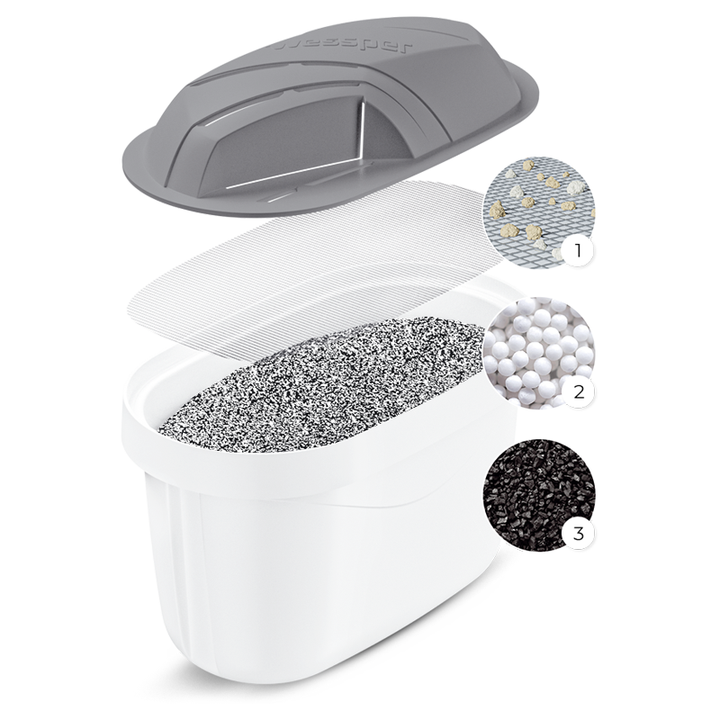 Żywica jonowymienna (2): Żywica jonowymienna w zwiększonej ilości jest odpowiedzialna za usuwanie metali ciężkich, takich jak ołów, miedź czy cynk, poprzez wymianę jonową. Dzięki temu twarda woda zostaje zmiękczona oraz uzyskuje dodatkową ochronę przed szkodliwymi substancjami.